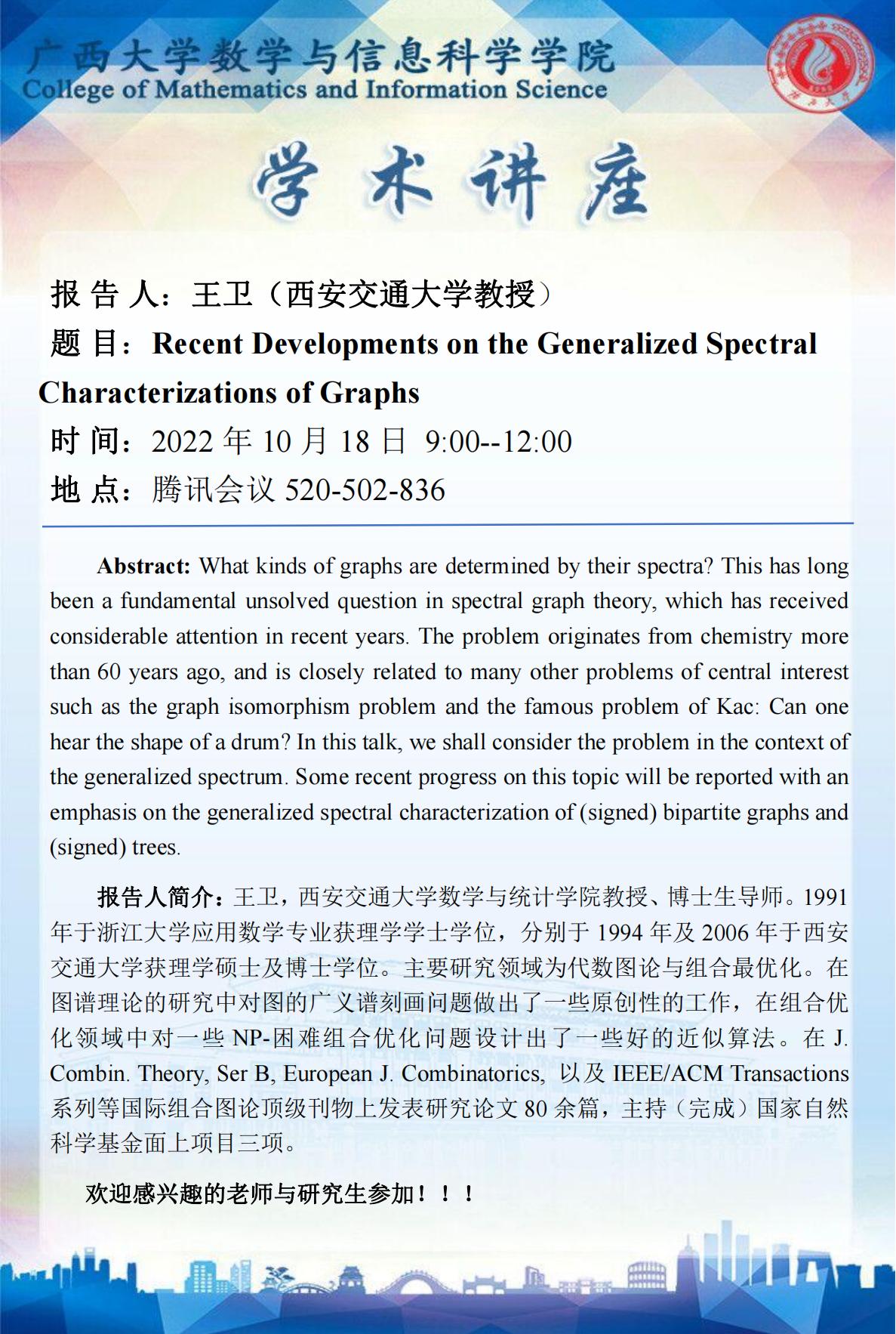 学术报告:Recent Developments on the Generalized Spectral Characterizations of Graphs