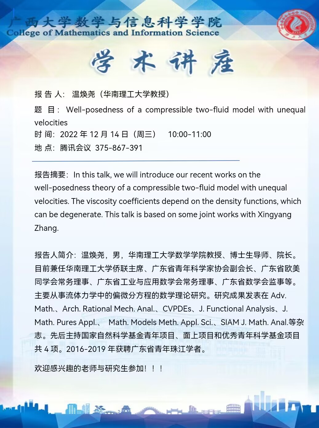学术讲座: Well-posedness of a compressible two-fluid model with unequa velocities