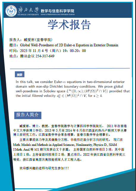 学术报告:Global Well-Posedness of 2D Euler-α Equation in Exterior Domain