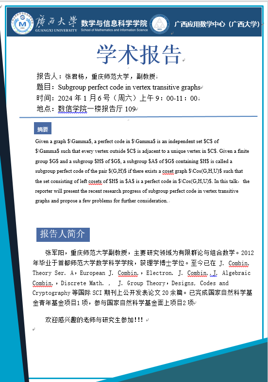 学术报告:Subgroup perfect code in vertex transitive graphs