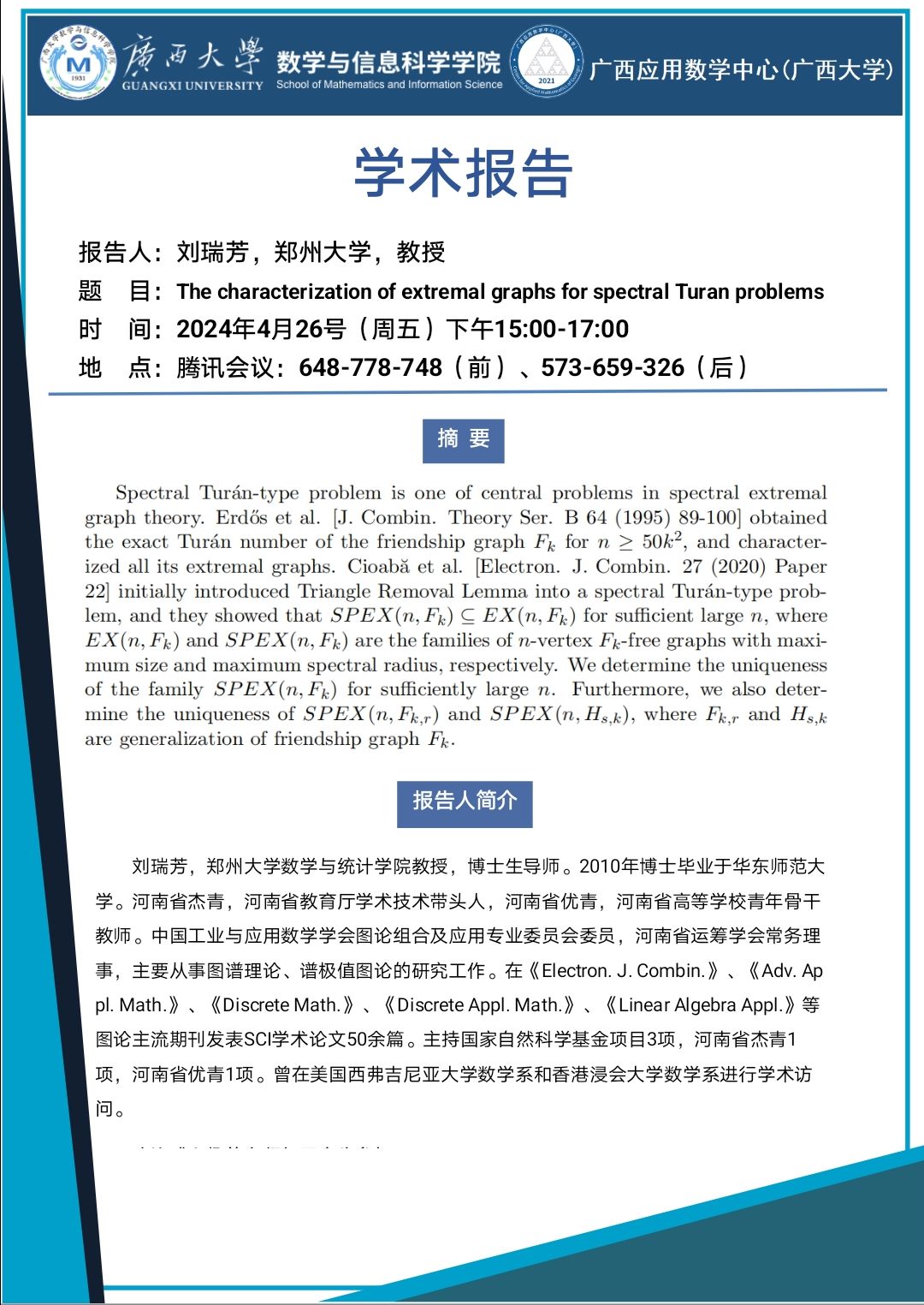 学术报告:The characterization of extremal graphs for spectral Turan problems