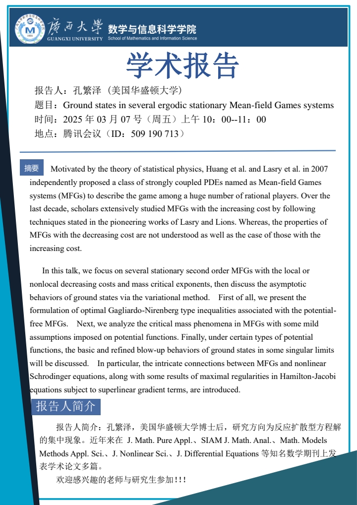 学术报告:Ground states in several ergodic stationary Mean-field Games systems