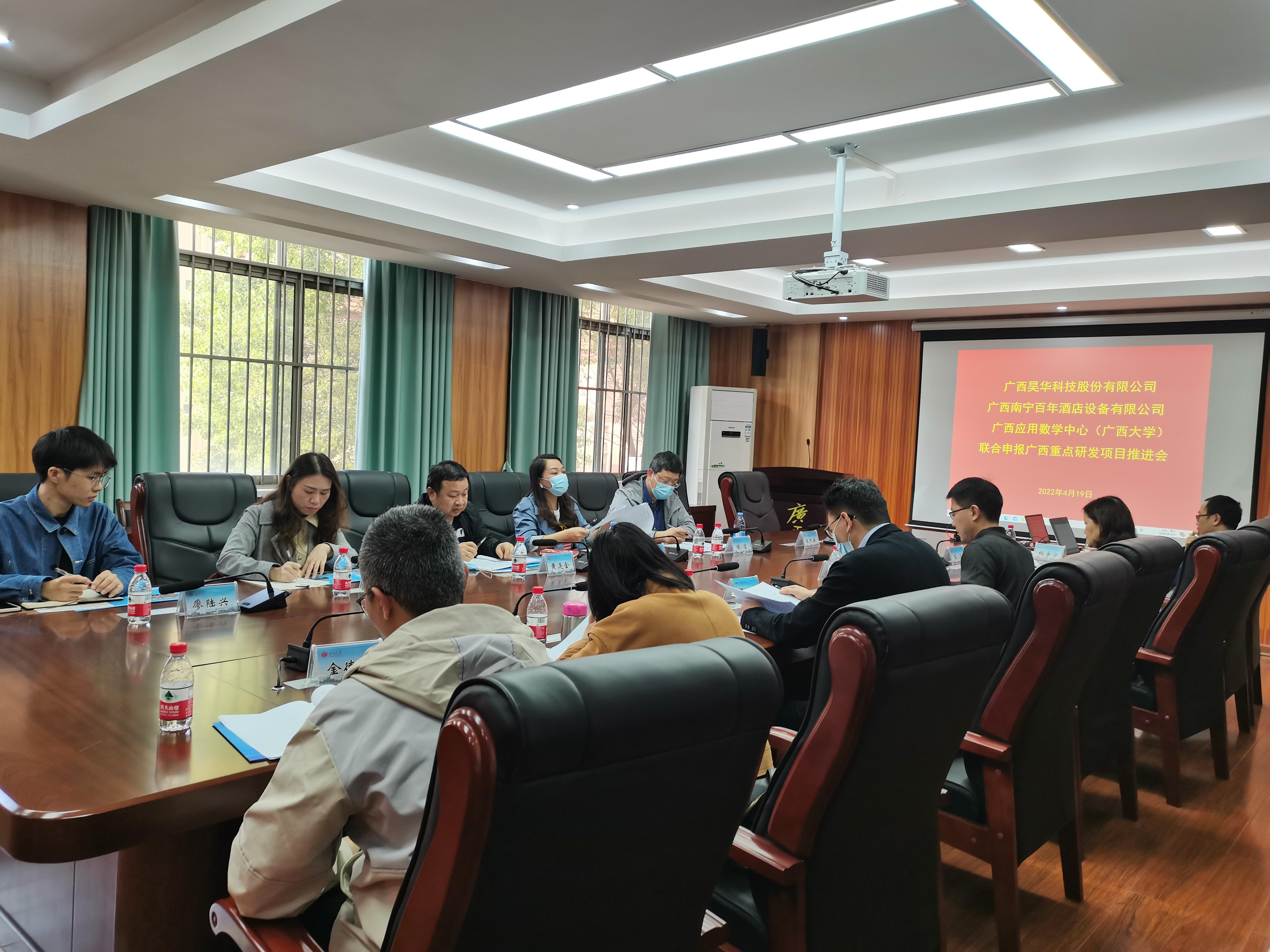 2022年4月19日,广西昊华科技股份有限公司、广西南宁百年酒店设备有限公司和广西应用数学中心(广西大学)在广西大学数学与信息科学学院召开联合申报广西重点研发项目推进会。广西南宁百年酒店设备有限公司总经理黄连金、副总经理侯洁,广西优耐信息技术有限公司项目申报部经理梁晶,广西应用数学中心(广西大学)常务副主任、广西大学数学与信息科学学院副院长袁功林,广西应用数学中心(广西大学)团队负责人等参加了此次会议。