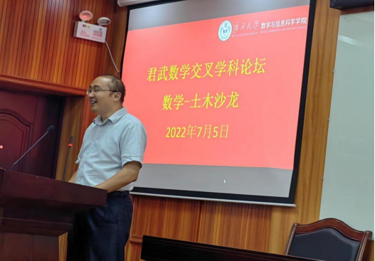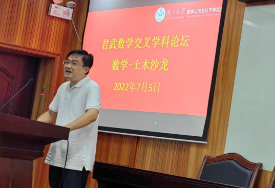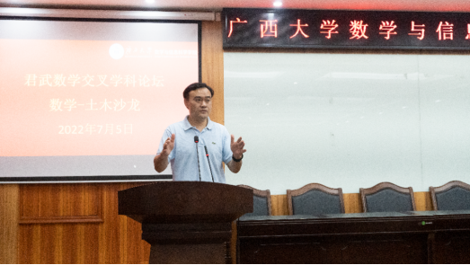 为深化广西大学学科交叉融合工作,推动学科协调发展,发挥数学作为基础学科的支撑作用,同时有力支持土木工程一流学科建设,挖掘应用数学与土木工程学科的交叉合作潜力,7月5日下午,广西大学首届“君武数学交叉学科论坛”之“数学—土木沙龙”在数信学院一楼报告厅举行。会议由数信学院院长郭真华主持。