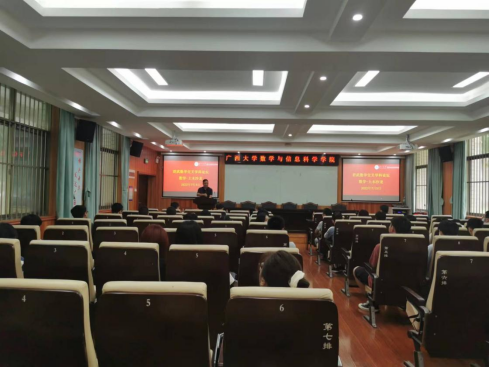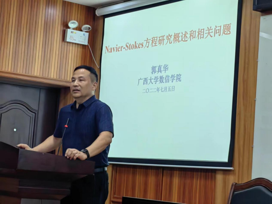 随后,数信学院院长郭真华向参会师生作题为《Navier-Stokes方程研究概述和相关问题》的报告。郭真华院长从Navier-Stokes方程的提出开始,讲述了流体力学的数学理论给数学学科提出的挑战,介绍了宏观流体力学的核心基本问题及关于Navier-Stokes方程近年来的一些研究成果,还分享了其当前正在研究的主要应用于石油开发与运输及血液动力学的相关问题。
