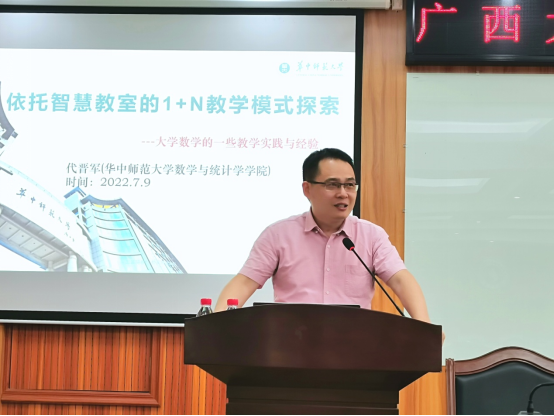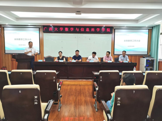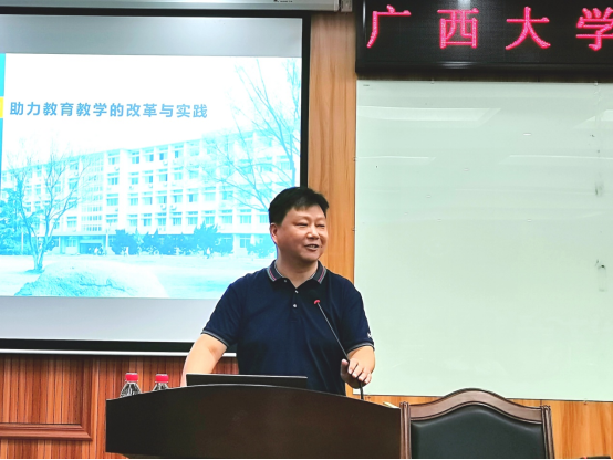 教学工作大会分为报告会和座谈会两个阶段进行。首先,大会特别邀请了华中师范大学数学与统计学院副院长郑高峰教授和代晋军副教授分别就教育信息化和智慧教学作了专题报告。随后,学院领导班子成员与教师代表就相关教学问题展开了积极对话与交流。广西大学发展规划处处长、副教务长赵双良,教务处处长耿葵花,数学与信息科学学院领导班子成员及全体教职工参加了本次大会。