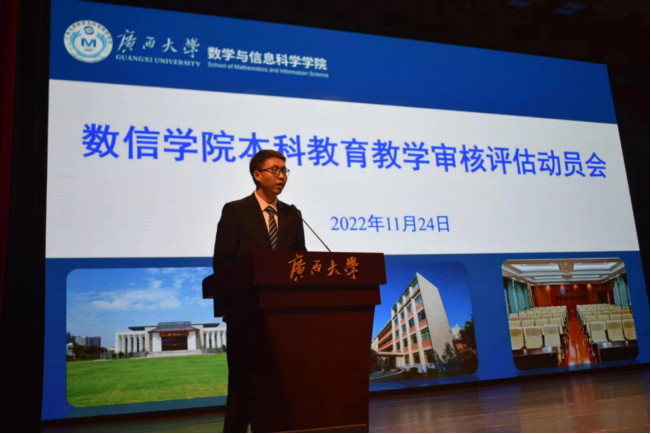 为做好我院迎评工作,带动全体本科生积极投身到评估工作中,助力学校评估工作顺利完成,11月24日晚,数信学院在大礼堂召开迎接本科教育教学审核评估动员会,院长郭真华做动员讲话,院党委副书记郭海燕主持会议,数信创培191班朱光洁作为学生代表宣读倡议书。全体辅导员,全体本科生参加会议。