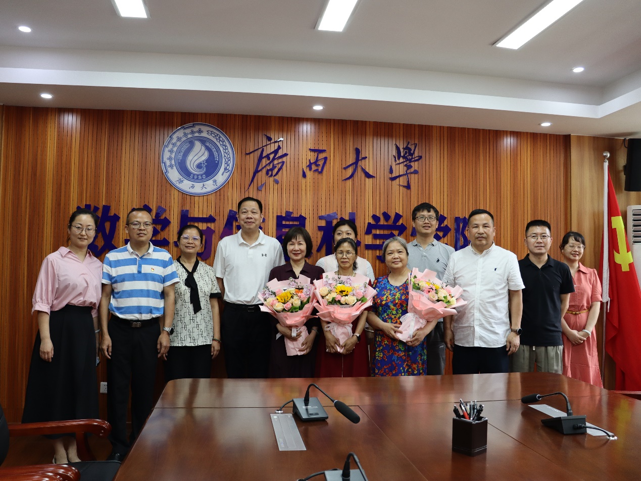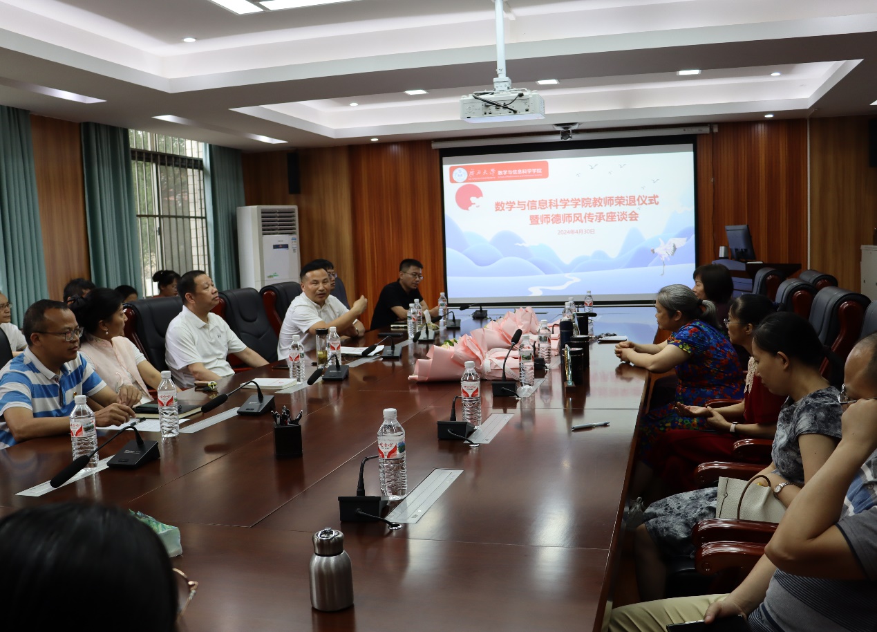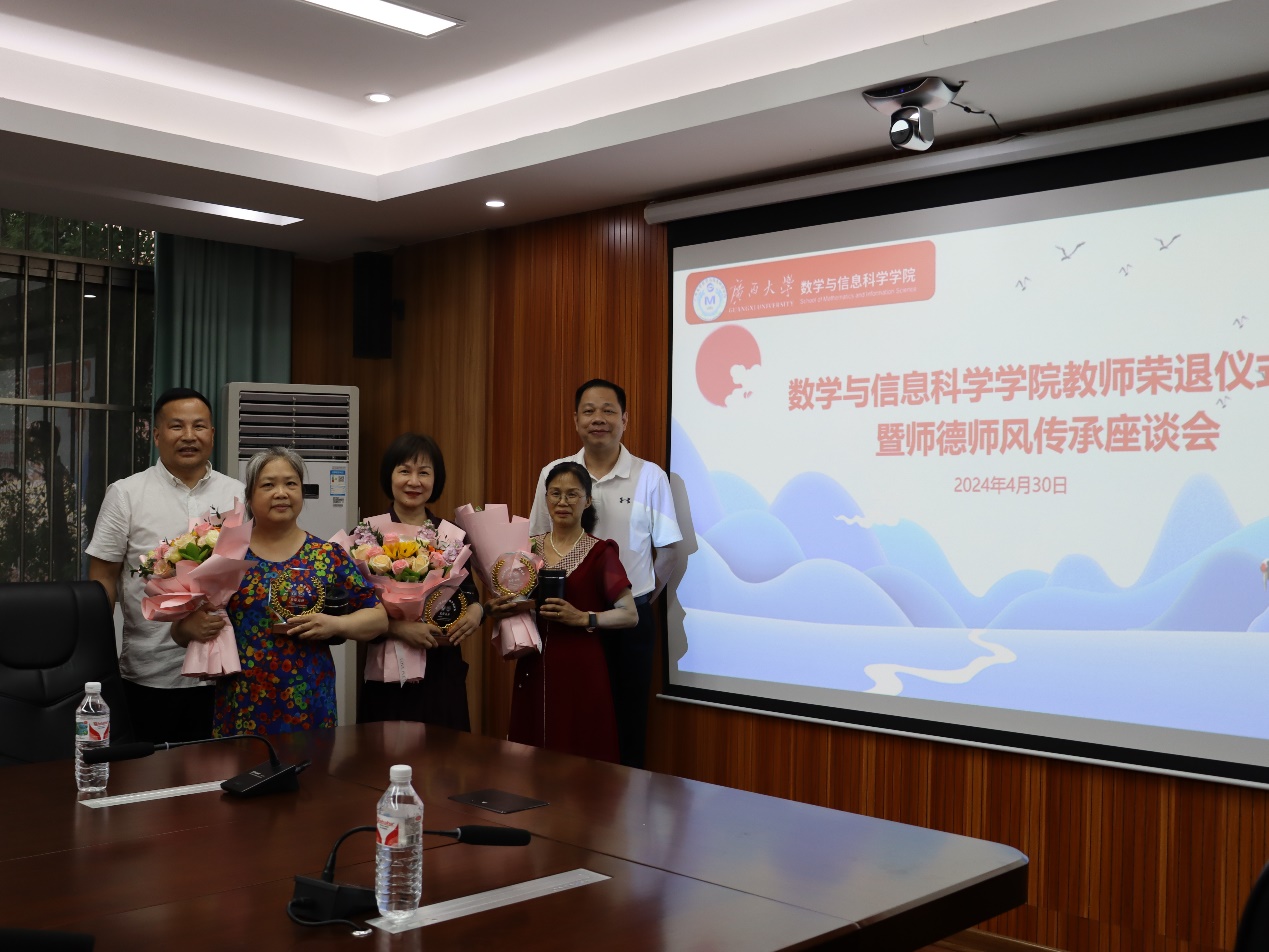 丹心化春雨,桃李满园香。为感谢我院退休教师刘建平、范英梅、卢小梅、郭海燕数十年如一日的默默坚守和无私奉献,进一步增强教师凝聚力,激励学院全体教师传承优良的师德师风。4月30日下午,数学与信息科学学院在214会议室举行教师荣退仪式暨师德师风传承座谈会。院党委书记覃宪儒、院长郭真华、学院领导班子全体成员,荣退教师及教职工代表出席仪式。荣退仪式由副院长石志刚主持。