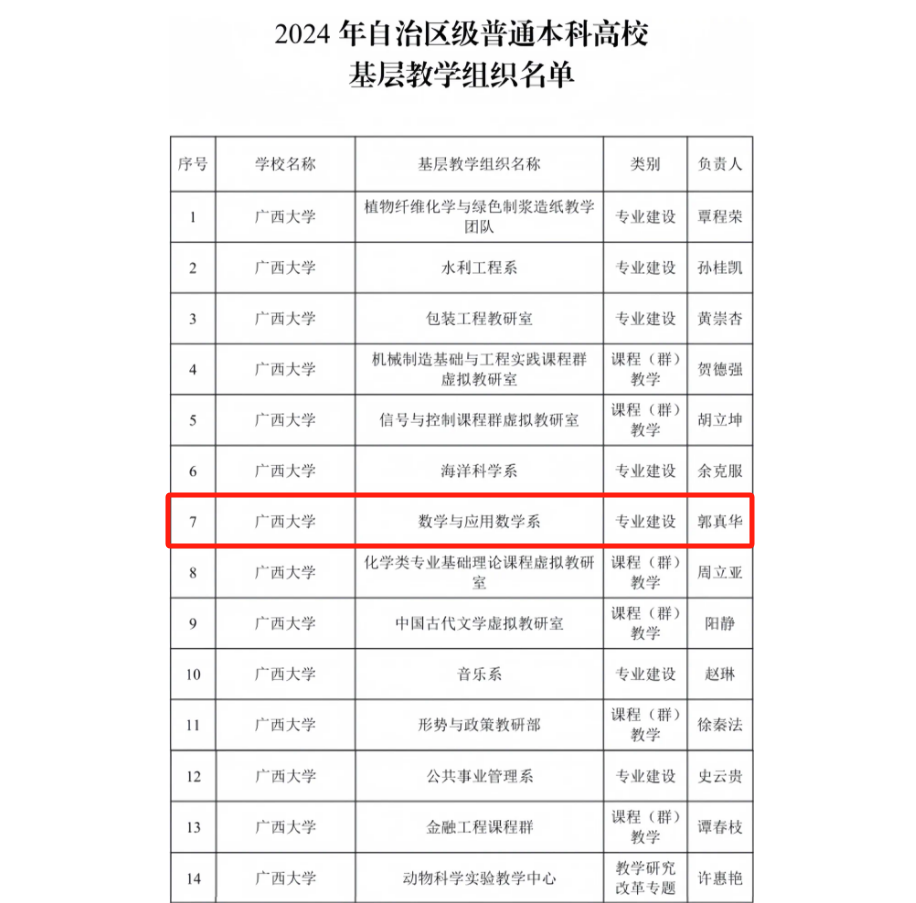 近日,自治区教育厅公布2024年自治区级普通本科高校基层教学组织名单,广西大学数学与信息科学学院申报的数学与应用数学系获认定为自治区级普通本科高校基层教学组织。