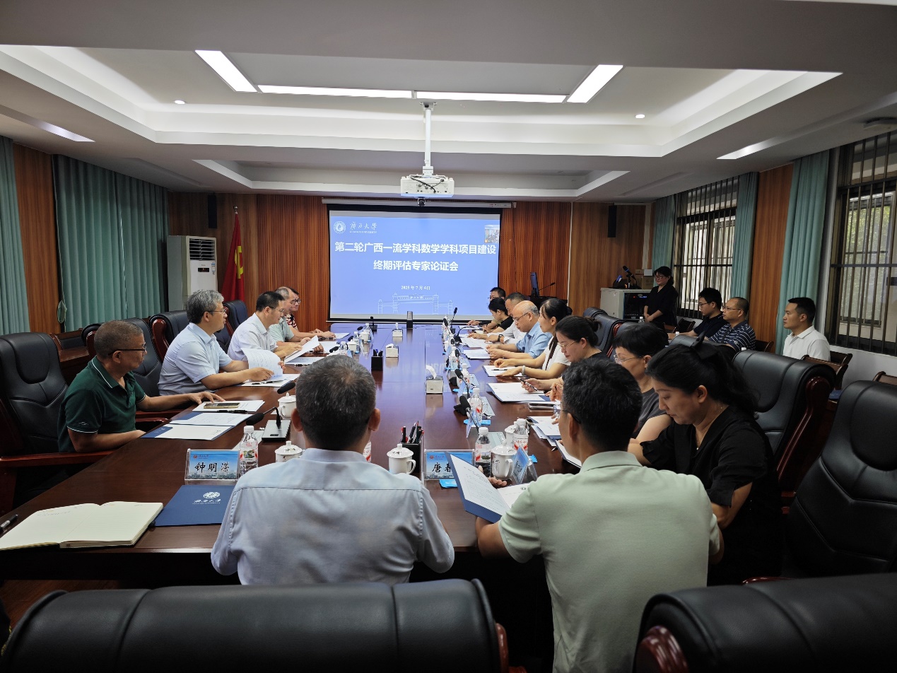 7月6日,我校召开第二轮广西一流学科数学学科项目建设终期评估专家论证会。博雅学者、华中师范大学数学与统计学学院邓引斌教授;教育部数学类专业教指委秘书长、北京航空航天大学数学学院韩德仁教授;广西高层次人才、广西民族大学数学科学学院刘振海教授;南宁师范大学党委副书记、校长隆广庆教授;教育部学科评议组专家、厦门大学数学科学学院谭忠教授;教育部数学类专业教指委委员、北部湾大学党委副书记唐高华教授;教育部学科评议组专家、西安交通大学数学与统计学院肖燕妮教授;浙江科技大学喻高航教授;中国数学学会常务理事、教育部学科评议组专家、武汉大学数学与统计学院赵会江教授共9人组成专家评估组对我校数学学科建设成效进行全面评审。校党委常委、副校长梁恩维出席会议并致辞。