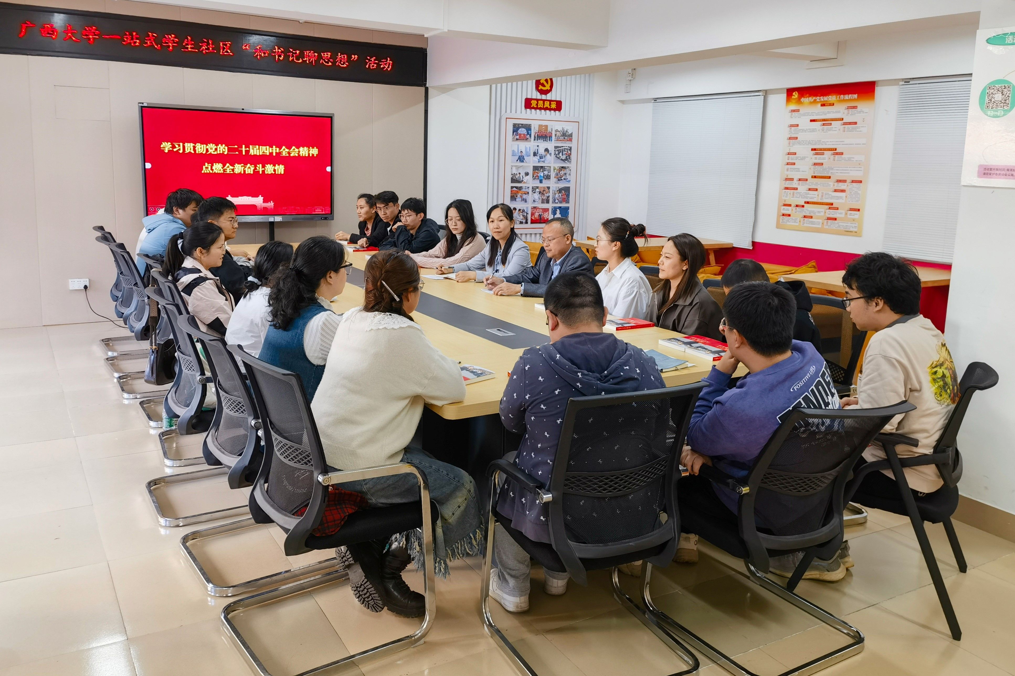 为深入学习贯彻党的二十届四中全会精神,激励我院博士生潜心科研、奋发进取、挺膺担当,11月12日下午,院党委书记吴华丽在西21栋学生一站式社区与我院18名博士生代表共同学习党的二十届四中全会精神,并进行座谈交流。院党委副书记、纪委书记石志刚主持座谈会。座谈会前,吴华丽向与会同学一一赠送了《习近平与大学生朋友们》。