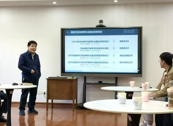 胡立坤从国家对高校教师队伍建设政策导向、高校核心职能考量教师发展、学校围绕教师发展工作总体方案、学院教师发展“616N”品牌建设、各类教师个人发展路径等五个方面梳理并解读了国家层面、自治区层面和学校层面关于青年教师发展的系列政策,帮助老师们明确未来发展目标和发展方向,鼓励大家结合自身实际制定合理规划,积极参加各类培训交流活动和青年教师教学竞赛,主动承担本科生“导师”工作,在参加比赛和指导学生的实践中提升专业素养,积累教学经验,提高教育教学能力。交流互动环节,胡立坤对老师们提出的问题一一做了解答,并以案例分析的方式就如何备赛青年教师教学竞赛作了详细指导。