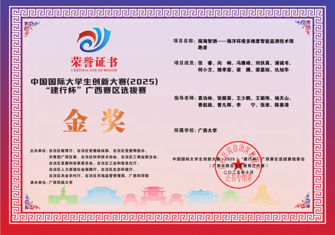 在中国国际大学生创新大赛(2025)“建行杯”广西赛区选拔赛中,我院袁功林教授教练组指导的“探海智测——海洋环境多维度智能监测技术领跑者”荣获金奖、“数盾云卫——智能多活容灾数据安全云服务革新者”荣获银奖,唐春明教授指导的“‘茧’尽全力——智能视觉下的桑蚕鲜茧分级系统”荣获银奖。