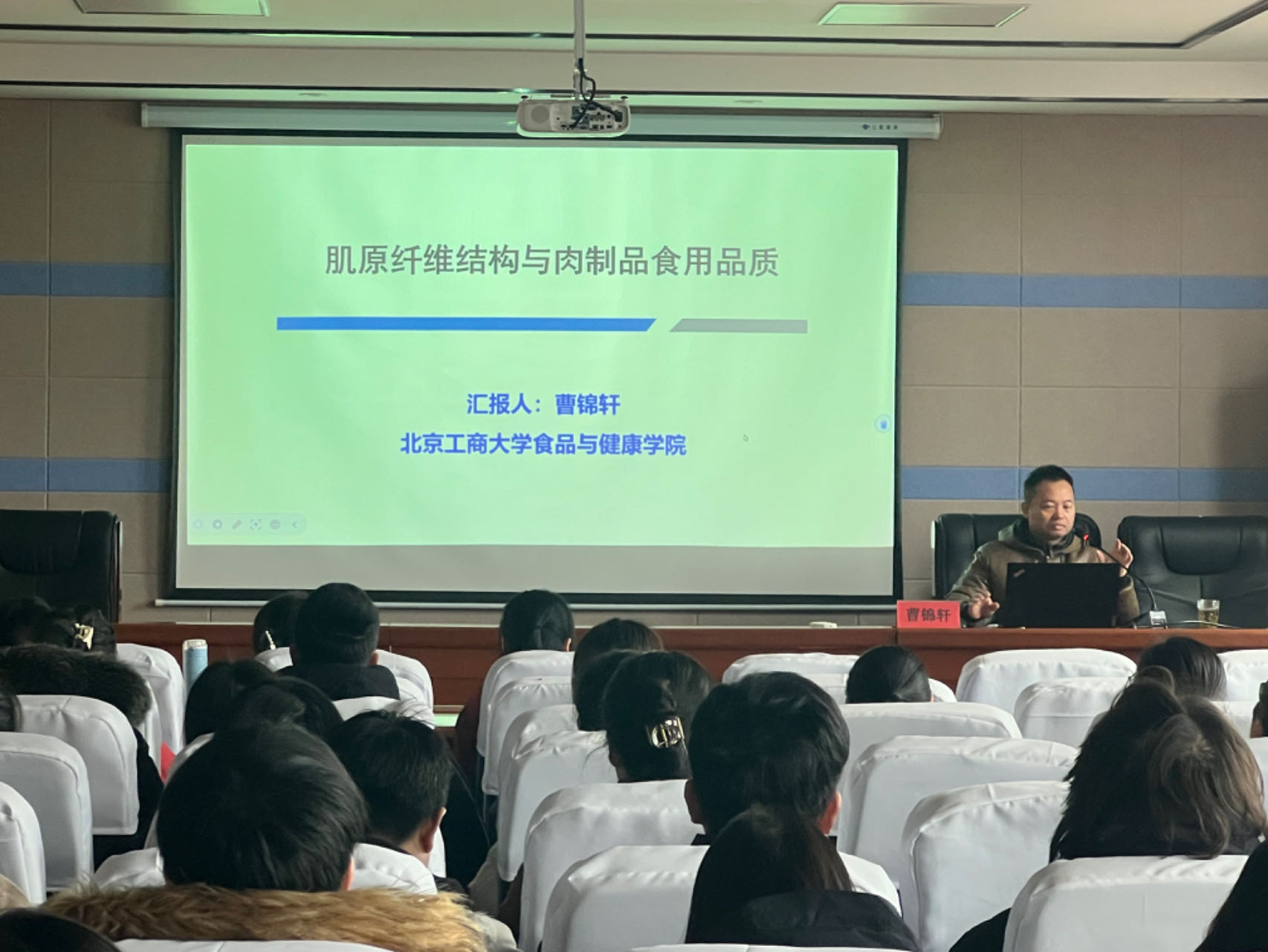 2024227午,我院举办的学术报告会在食品学院517举行。本次报告会邀请北京工商大学曹锦轩教授作主题为“肌原纤维结构与肉制品食用品质”的学术报告。我院上百名师生聆听了本次报告会。