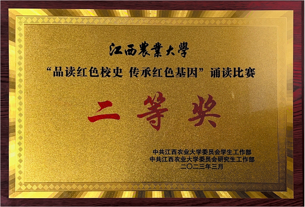 3月16日晚,由中共江西农业大学委员会学生工作部、中共江西农业大学委员会研究生工作部主办的“品读红色校史 传承红色基因”诵读比赛在学校大礼堂举行,我院选派节目《乾乾先贤 巍巍江农》参赛,经过激烈角逐,荣获第三名、二等奖。