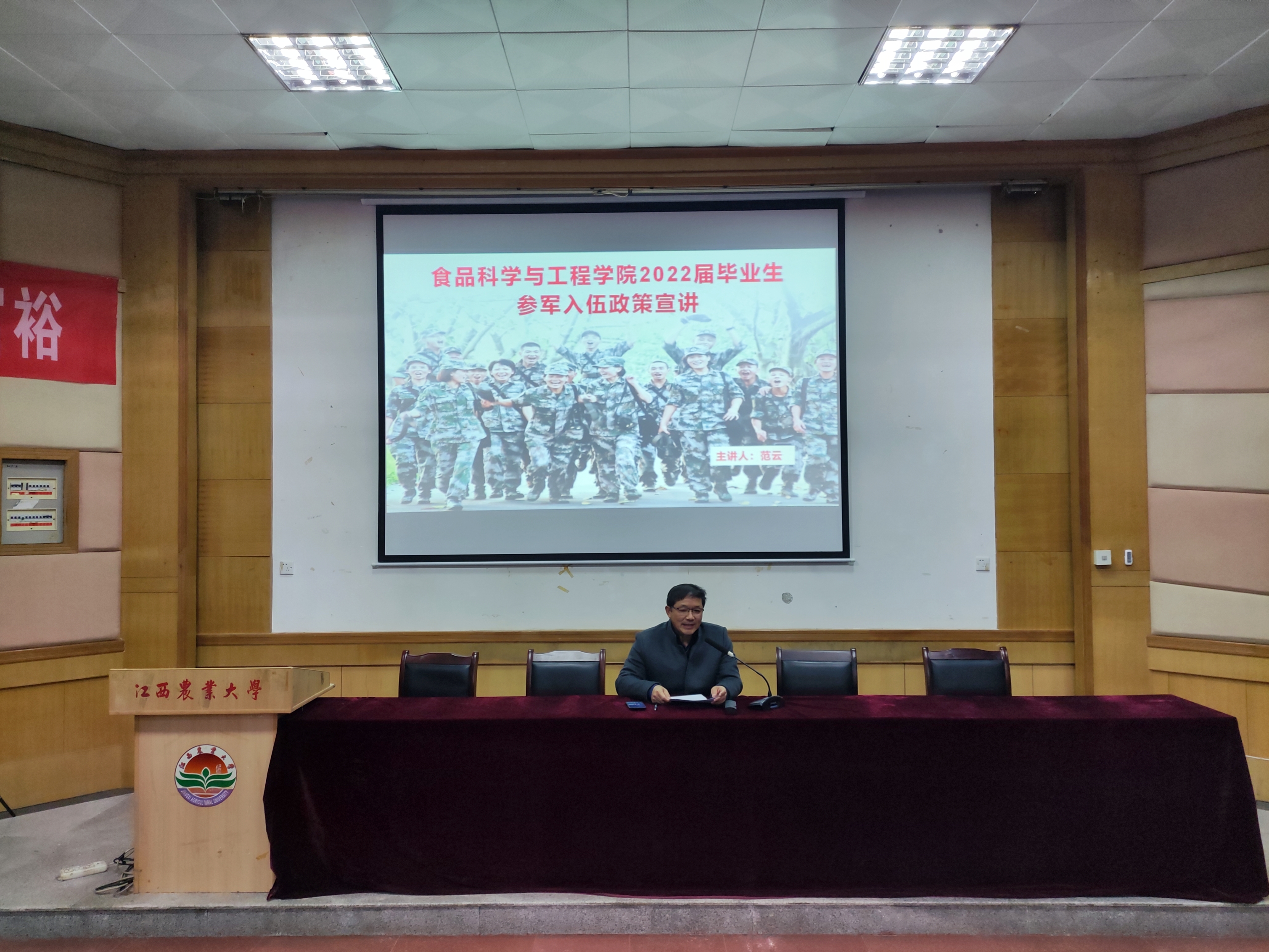 为进一步为做好学院2022年度大学生征兵工作,帮助学院2022届毕业生了解入伍政策,鼓励更多本科毕业生报名参军入伍,12月28日,学院党委书记范云在继续教育学院报告厅面向学院2022届本科毕业生开展入伍政策专题宣讲,学院两百余名毕业生参加宣讲会。