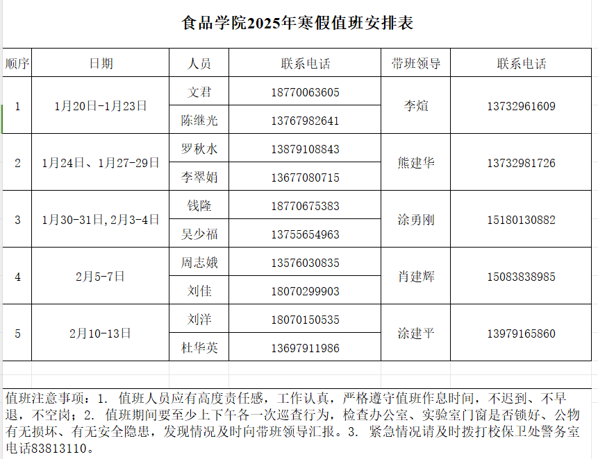 食品学院2025年寒假值班安排表