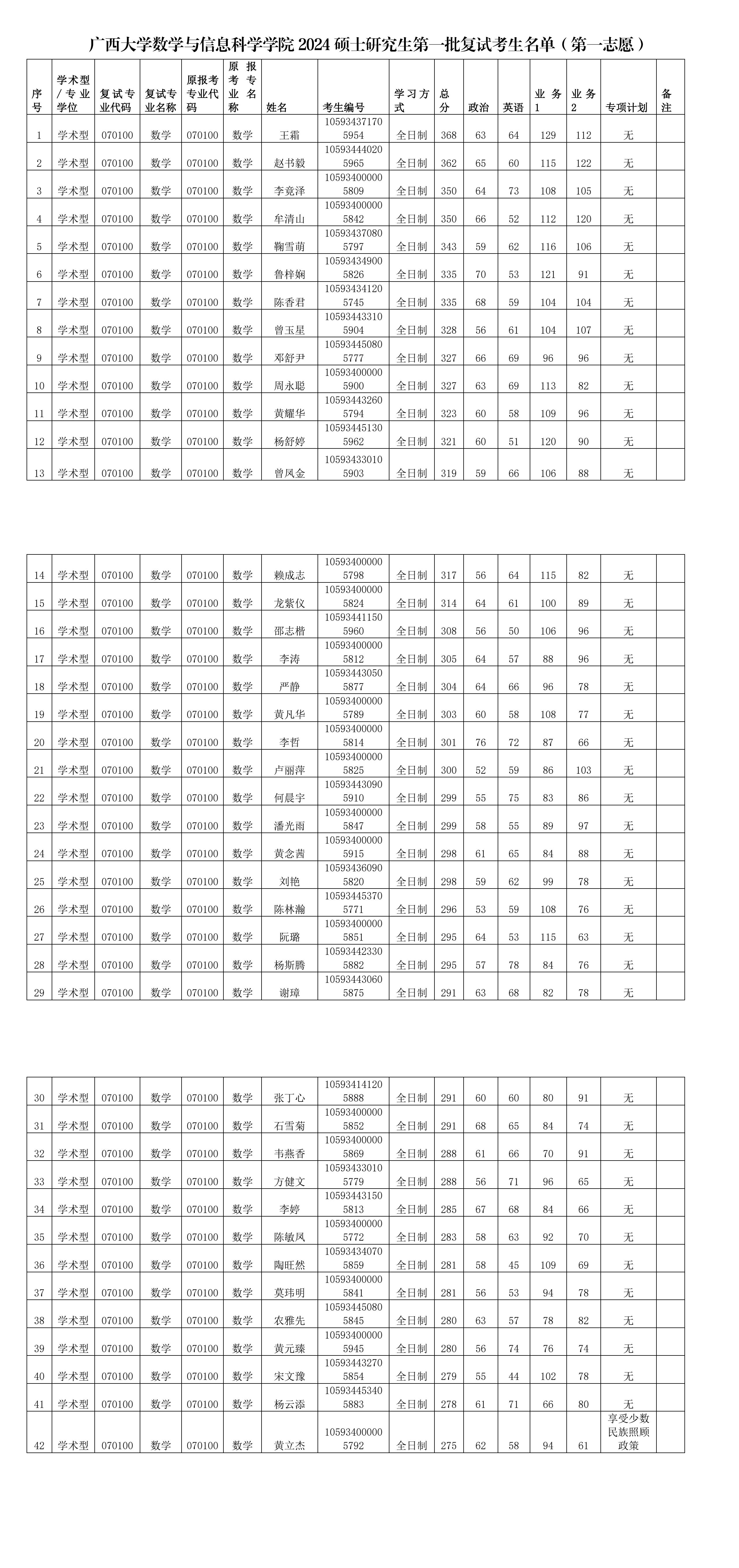 广西大学数学与信息科学学院2024硕士研究生第一批复试考生名单(第一志愿)