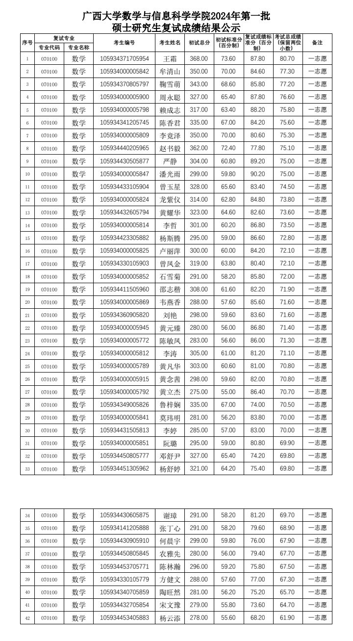 广西大学数学与信息科学学院2024年第一批硕士研究生复试成绩结果公示