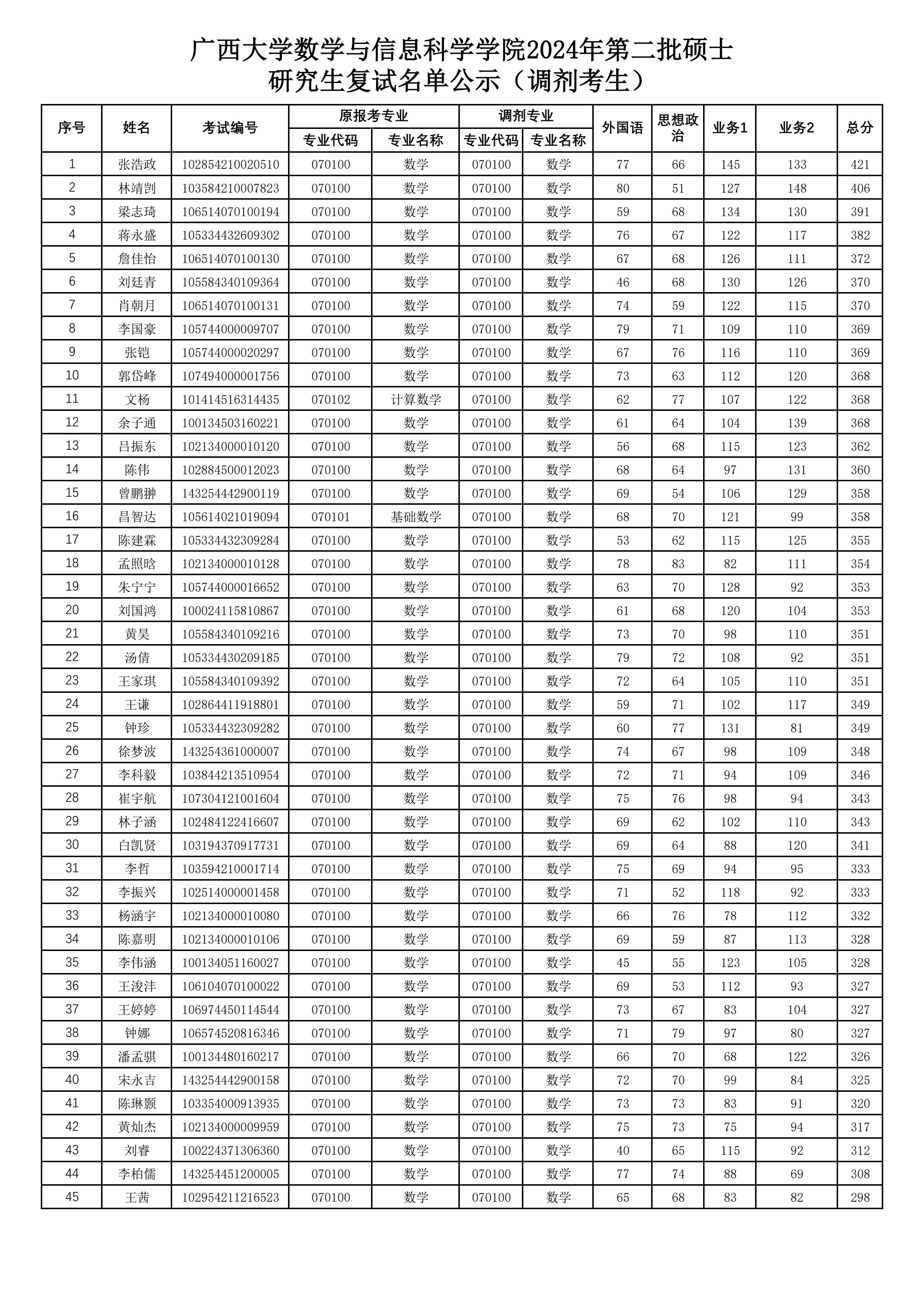 广西大学数学与信息科学学院2024年第二批硕士研究生复试名单公示(调剂考生)