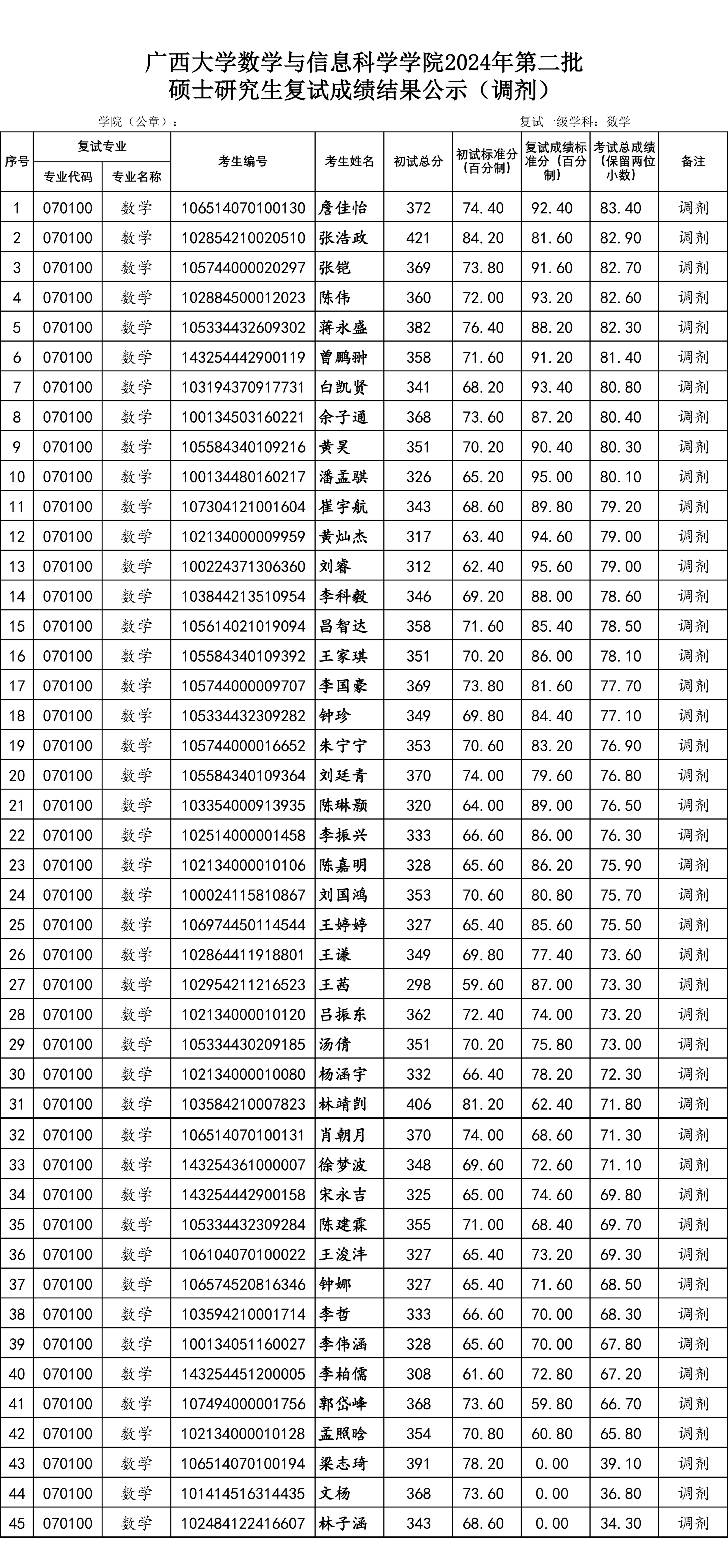 广西大学数学与信息科学学院2024年第二批硕士研究生复试名单公示(调剂考生)