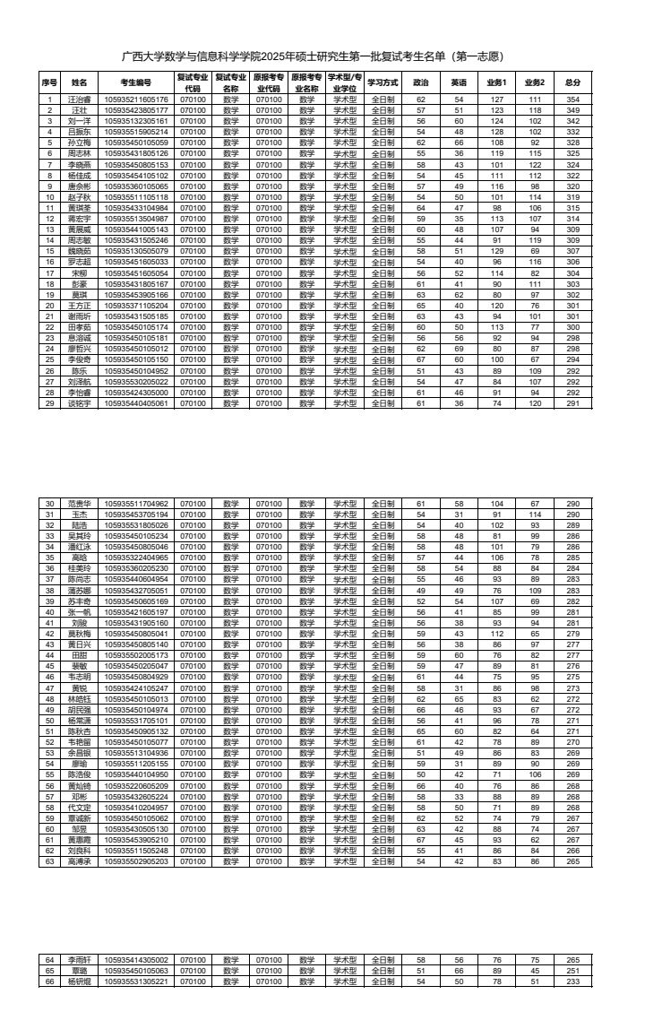 广西大学数学与信息科学学院2025年硕士研究生第一批复试考生名单(第一志愿)