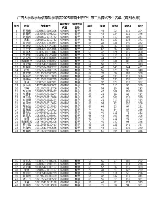 广西大学数学与信息科学学院2025年第二批硕士研究生复试成绩结果公示(调剂)