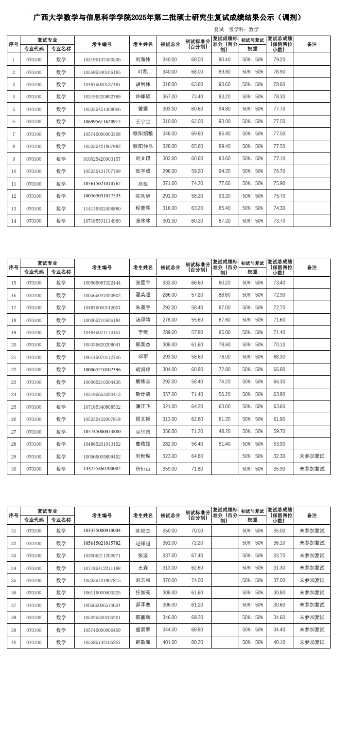 广西大学数学与信息科学学院2025年第二批硕士研究生复试成绩结果公示(调剂)